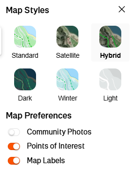 Strava offers different map layers, and I usually use the Hybrid view, which combines satellite imagery with place names. I do wish it included more detailed labels for smaller towns and local points of interest — that would make orientation even easier.